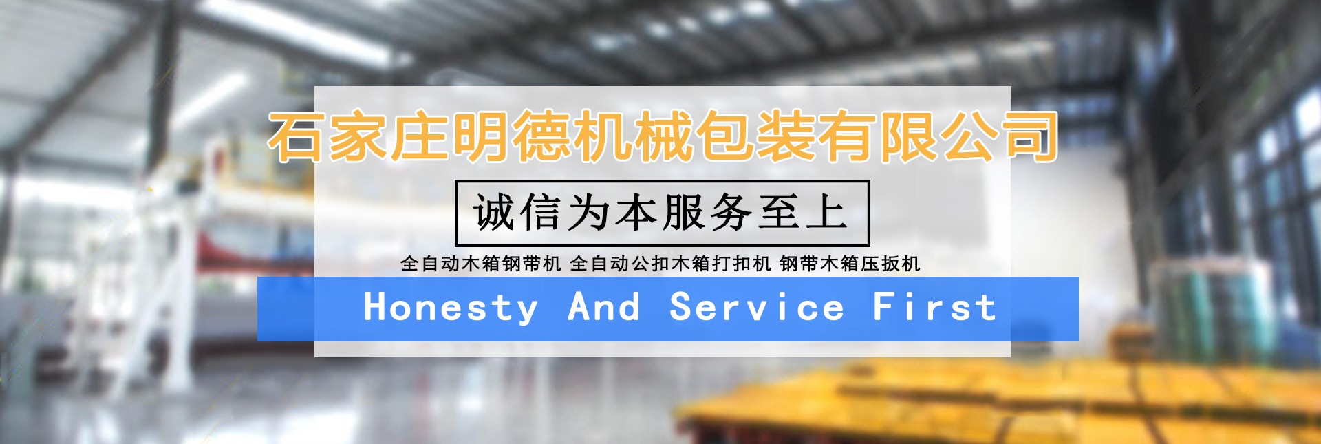 石家莊明德包裝機械有限公司是國內專業生產木全自動木箱鋼帶機、半自動公母扣木箱打扣機、全自動雙排孔定長切斷機、美式托盤打釘機械、托盤刨槽機、倒角機、木包裝箱、木托盤的生產廠家。